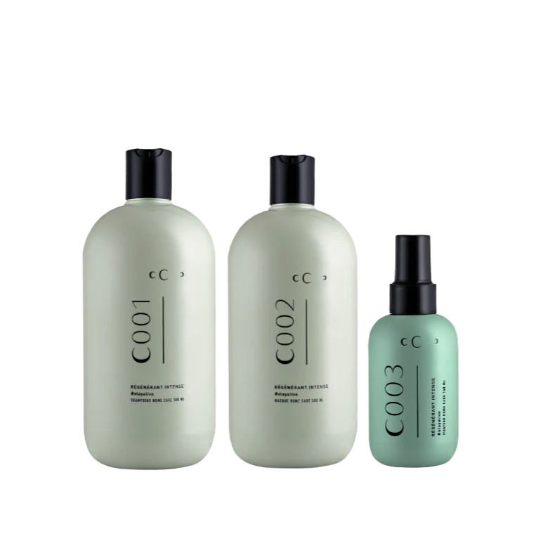 - Appliquer sur cheveux humides le Masque Régénérant Intense C002 laissez poser 10 mn puis rincez abondamment.